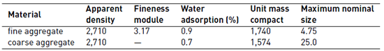 The hardened concrete density was evaluated at the age of 28 days according to ASTM C1754. Compressive strength tests were carried out on an electro-hydraulic servo-controlled machine with a 1,500 kN capacity. An axial load was applied to the cylinders at a constant load ratio of 0.6 MPa/s. The density (ρ) and module of elasticity (Ec ) were evaluated using Equations 1 and 2, respectively.