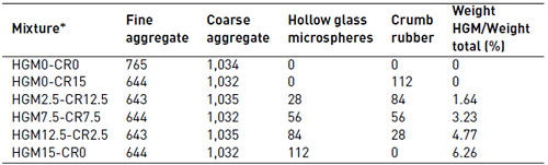 The constituent materials used for preparing the concrete in this study include Portland cement with a specific density of 3,050 Kg/m3 according to NTC 221 (Colombian Technical Standard) and tap water. Experiments were done to determine the unit compact mass NTC 92 [19], bulk density of fine aggregate NTC 196 [20], bulk density of the coarse aggregate NTC 237 [21], as well as the particle size distribution NTC 77 [22]. HGM (HGM) (particle size of 200 microns and density of 2,400 Kg/m3) were provided by FABCOM SAS. CR was supplied by the company 4R Soluciones Ambientales SAS, the density of the material was 1,109 Kg/m3. A water/cement ratio of 0.58 was used for all mixture. The main properties of the fine and coarse aggregates are summarized in Table 1.