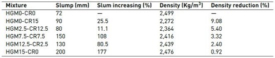 For the preparation of the mixtures, the coarse aggregate was moistened to reach Saturated Surface Dry (SSD) condition. Before mixing begins, the interior of the mixer is moistened. First, the coarse aggregate, the sand, and the CR were mixed until a homogeneous mixture was attained. The cement and 75% of the water were then added and mixed for 4 minutes. When a cohesive and fluid paste was observed, the HGM (in the case of mixtures with HGM) and the remaining 25% of water were added. The slump test was used according to the requirements of NTC 396 to analyze the properties of fresh concrete [24]. The mold was filled in three layers of fresh concrete mixture, each approximately one-third of the height of mold and compacted. Each layer was compacted with a tamping rod 25 times. After the top layer was compacted, the surface was struck off with the compacting rod. Immediately after slump cone was lifted, the slump was measured by determining the difference between the height of the mold and that of the highest point of the slumped test mixture.