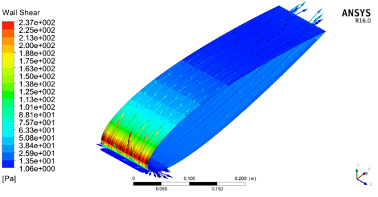 Another numerical study at Reynolds number of 800 was conducted by [17]. This simulation shows that vortexes originate from both sides of the tubercles peaks in a counter-rotating manner, which form a Kelvin-Helmholtz instability. The Refs. [18] and [19] observed a similar behavior from their numerical simulation of an airfoil with tubercles at a higher Reynolds number of 120,000. Those studies use a stalled NACA 0021 airfoil at 20 degrees incidence angle making use of LES (Large Eddy Simulation) to resolve the flow. They also observed the Kelvin-Helmholtz instabilities at the peaks surfaces of the tubercles. The Ref. [18] noted another flow mechanism of airfoil with tubercles, in which a strong pressure gradient in the spanwise direction causes a secondary flow for a configuration with a wavy leading edge. This secondary flow contributes to boundary layer re-energizing, which delays flow separation.