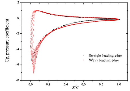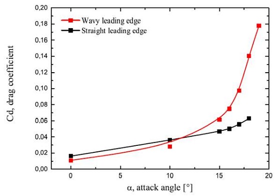 Motivated by the tubercles function of the humpback flipper, [3] carried out numerical studies of the sinusoidal leading edge that showed a potential gain in aerodynamic and hydrodynamic efficiency. These simulations were performed using an airfoil NACA 63021 with finite-span (aspect ratio of 2.04). The panel method with an inviscid flow suitable for large Reynolds number was employed. At an angle of attack 10 degrees, the wavy shape incorporated at the leading edge resulted in an increase of 4.8% in the lift force, a decrease of 10.9% in the induced drag, and an increase in the lift to drag ratio by 17.6%. With the work of [3], it may be concluded that the wavy leading edge enhances wing performance at modest angles of attack, while offering no significant effects at zero angles of attack. However, for a viscous calculation form drag increases by 11% at α = 10◦.