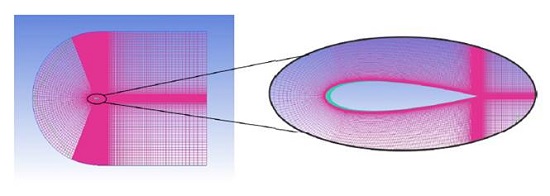 With regard to the mesh, towards the wall surfaces the mesh is refined smoothly up to a non-dimensional wall distance of y+ ≈ 1. At the wake region, downstream the airfoil, the mesh is also smoothly refined, as shown in Figure 2. The mesh has a total of 2,288,000 cells. Along the spanwise direction 20 cell volumes are used, at the airfoil leading edge 230 cells volumes are applied, along the airfoil upper or botton surface 230 cells volumes are set and, finally, at the trailing edge 130 cells are used.