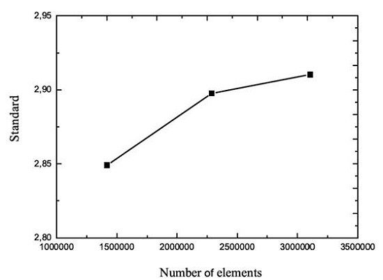 Keeping the C-type structured mesh set-up as shown in Figure 2, three differentt levels of mesh refinement are considered to evaluate its influence on the numerical results, respectively, of 1,420,000 cells (coarse mesh), 2,288,000 cells (medium mesh) and 3,104,000 (fine mesh) cells. For the coarse and fine mesh, the same cell volume proportion number of the medium mesh as described in the previous section, is applied, which is, thus, scaled, respectively, to 1,420,000 and 3,104,000 cells.