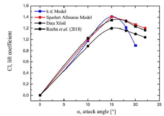 The aerodynamic lift forces for the straight leading edge configuration obtained by the two turbulent models are compared within the angle of attack range 0◦ < α < 22.5◦, for a Reynolds number of 3X106, as shown in Figure 5. The results are also compared with the corresponding experimental data extracted from [27] and the Xfoil panel method code [26]. From this study, it can be noted that the results provided by the Spalart-Allmaras turbulence model present better agreement with the corresponding results of Xfoil and [27], especially at the post-stall regime. Thus, the Spalart-Allmaras turbulence model is chosen as the base RANS turbulence model for all numerical results to be presented with both straight and wavy leading edge configurations.