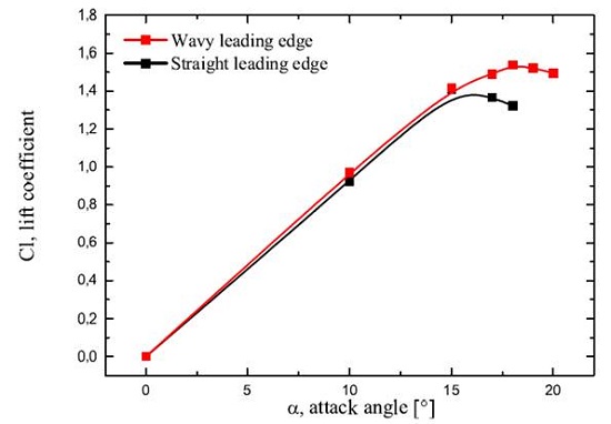 The first experimental study of the wavy leading edge was carried out by [4], who built a scale model of a flipper using a NACA 0020 airfoil in wind tunnel testing with a Reynolds number range from 505,000 to 520,000. The tests showed promising results with an increase of 40% on the stall angle and 6% in the maximum lift, and a decrease of 32% in the drag on the post-stall regime when compared with smooth flipper model. At a low angle of attack, both models showed similar results. However, at a limited range of 10.3◦< α < 10.8◦ , a higher drag was observed when compared with the correspond smooth model. The authors have observed that specifically the scalloped leading edge of flipper has the function of delaying stall, which provides higher lift at higher angles of attack. The results of [4] have motivated later studies in the wavy leading edge phenomenon [5-9].