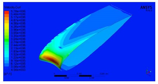 Regarding the drag force change with angle of attack obtained by the numerical simulations as shown in Figure 7. For small angles in the range 0◦ < α < 12.5◦, it can be noted that the drag coefficient of the WLE airfoil is in the same order if compared with the corresponding drag of the SLE airfoil. However, as the angle of attack increases approaching the stall condition, approximately at α = 15◦, the WLE airfoil presents a drag coefficient 31.1% greater than the corresponding SLE airfoil. This increase of the drag coefficient in the airfoil with WLE for high angles of attack may be explained by the presence of flow re-circulation in the trough of the wavy leading edge, which is clearly seen from the vorticity field shown in Figure 8.