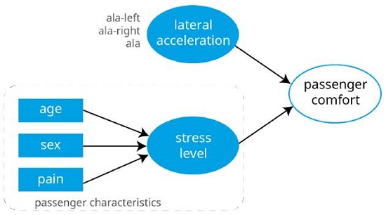 The SEM was used to analyze whether comfort depends on the characteristics of the passengers (age, sex, stress level and passenger pain level) and lateral accelerations. SEM has been previously used to model passenger comfort on railways [16]. The LISREL 10.2 software was used to apply the SEM [26]. Before this, an initial model was conceptualized, as shown in Figure 4, presuming relationships between lateral variables. In this case, the age, sex, and level of pain affect the stress level. This level, along with lateral acceleration, influences the participant's comfort. Lateral accelerations are the average of left curves or ala-left (horizontal curves that turn to the left in the driving direction), right curves or ala-right (horizontal curves that turn to the right in the driving direction) and both or ala. Other variables can affect comfort; however, they are beyond the scope of this research.
