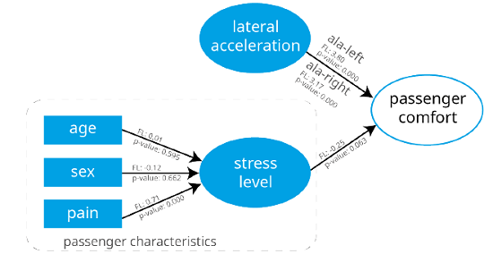 To fit the initial model, the maximum likelihood method (α=0.05) was employed to estimate SEM using the LISREL 10.2 software. The average lateral acceleration (ala) was ruled out due to its low value of factor loading and T-value (-0.17) and presented multicollinearity with ala-left and ala-right factors. Therefore, Figure 5 shows the variables’ loading factors in each model and its level of significance (p-value). In the model of the stress, the age and sex have little statistical significance, but not with pain, which explains about 70% of the variance of that model. Another research found some differences between sex in the symptoms of motion sickness [17]. In the second model, both lateral accelerations are predictors of comfort. Lateral accelerations of left curves are negative; therefore, the factor will also be negative. On the other hand, the stress level is also significant for comfort, but in a more moderate proportion than the previous ones. This relationship makes sense: when the level of stress is low, the comfort would be high, and vice-versa. Based on this analysis, the initial model must be adjusted through the SEM.