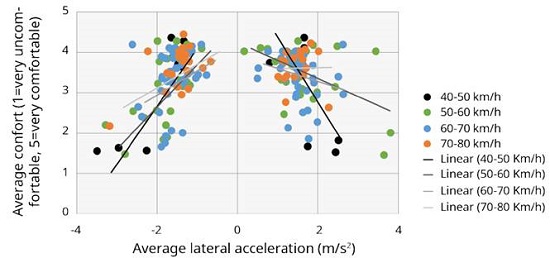 Speed impacts passenger comfort. When the speed is low, passengers can reach the highest level of comfort, while at high speeds, they reported lower levels of comfort. In general, high speeds could be reached in curves with a big radius, so it is expected that the normal reaction of a passenger will be to feel unsafe. However, if the curve has a small radius and the vehicle drives at a high speed, the passenger will feel the centripetal force more and, consequently, more discomfort.