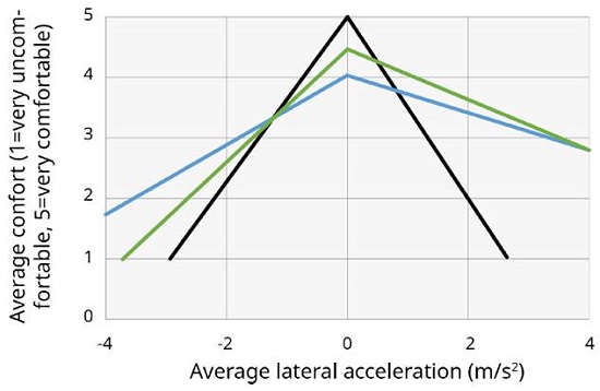 China has the following threshold: unbeareable: > 5 m/s2, uncomfortable: 3.6 to 5.0 km/h, relatively comfortable: 1.8 to 3.6 km/h, and comfortable: 0 to 1.8 km/h [1]. Using the absolute value from Table 2 for both curves, the following threshold can be calculated for the current research: very uncomfortable: 3.1 to 7.5 m/s2, uncomfortable: 2.4 to 6.2 m/s2, undecided: 1.8 to 2.9 m/s2, comfortable: 0.4 to 1.3 m/s2, and very comfortable: 0 to 0.6 m/s2. Some of those values are close to the ones from China; however, the numbers of this study are more detailed, since it separates the lateral accelerations of right and left curves.