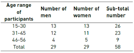 Sampling was not probabilistic and intentional. As a result, 58 subjects participated in the study, as seen in Table 1. Generally, it allocated three to four passengers on every trip, besides the driver. The 50% distribution between men and women was intentionally requested, given the sex population distribution in the city and the country [25]. Participants had a wide age range (15-56 years).