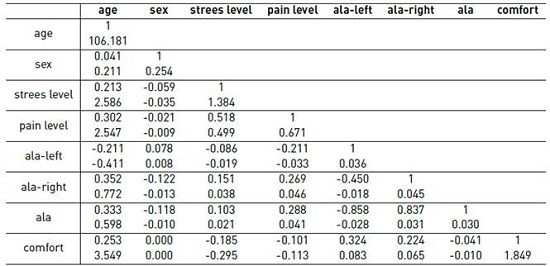 Table 2 shows the correlation and covariance matrix of the conceptualization variables. The variables that have higher correlation values (>0.8) are ala-left and ala-right with ala. In this case, there is multicollinearity, because the lateral accelerations in left or right curves are related to the average of the horizontal curves. Therefore, ala could not be with the other lateral acceleration variables in the same model. The variable age has the highest variance of 106.181. The total variance is 110.451 (largest eigenvalue = 106.438; smallest eigenvalue ≈ 0), generating a condition number of 971.427, which indicates multicollinearity (in linear regression).