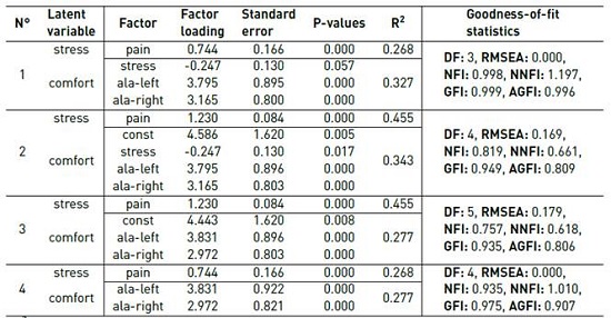 As can be seen in Table 3, the structural equations that have the best fit correspond to analysis 4. Analysis 1 also has a good fit and even has a higher R2 value for the comfort model. However, the p-value of the stress factor (0.057) slightly exceeds the adopted value in this analysis; therefore, the models in examination 4 are reliable and valid.