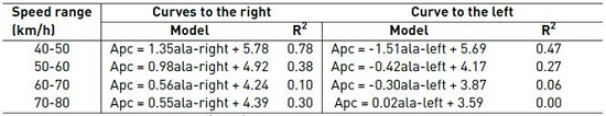 Some of the models in Table 4 have an acceptable fit to the collected and processed data. However, they need theoretical adjustments to be used in practice (see Table 6]. In these new models from Table 6, the equations between 40-50 km/h have a maximum value of five. The constant of the models between 50-60 km/h was an average between the models for right and left curves, so they intercept in the same vertical comfort point. The same happened in the case of models between 60-70 km/h. In right curves, the equation between 70-80 km/h does not have a significant difference with the model between 60-70 km/h; therefore, just one of them could be used. Based on this assumption, for the last model of the left curve, the model with the highest value of R2 could be taken for both speed ranges: 60-70 km/h and 70-80 km/h.