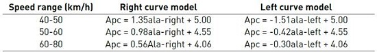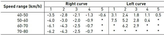 Using the equation from Table 4, the maximum lateral acceleration values can be obtained in every speed range and comfort condition (see Table 5]. For these thresholds, in the results of the equations, incoherent values were not considered; that is, the positive ones of the equations of left curves, the negative values of right curves, and the values outside the conventional lateral acceleration thresholds.