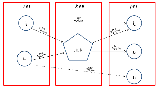 After presenting the mathematical model, Figure 1 illustrates the flows allowed between the echelons, according to assumption number six presented at the beginning of this section. The dashed line represents the direct flows, from a production zone i to a demand zone j. These flows are represented by variables in the mathematical model. The non-dashed line represents the indirect flows through a LIC, whose origin-destination matrix should be guaranteed. Then, it is represented by different variables in the model: