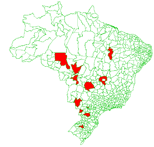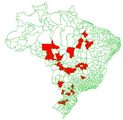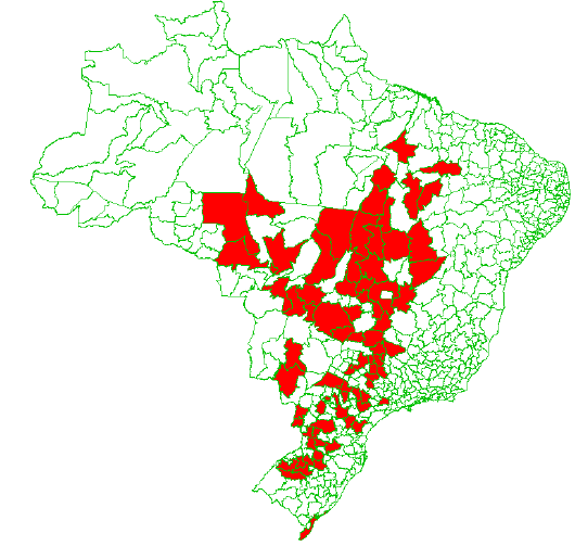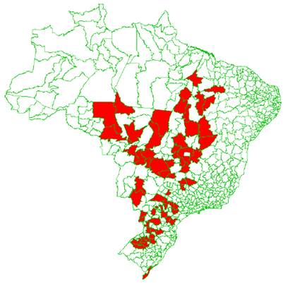 Figures 4 and 5 show the microregions enabled in Scenarios 1 and 2, respectively. In the first case, 68 microregions (of the 80 candidates) were indicated for opening LICs. This value was reduced to 37, when a lower limit was imposed for structures. This means that in Scenario 1, almost half of the facilities were opened to move less than 1 million t of soy.