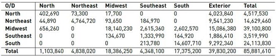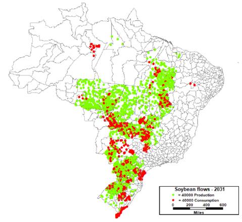 The PNLT multimodal network predicted for the year 2031 already considers the infrastructure projects foreseen in the plan. We established that road would be used as the unimodal alternative for the direct transport (without using a LIC), since almost 60% of the Brazilian freight transportation are done by this alternative, which is often used to transport soybean. In the case of transport through a LIC, the soybean would be destined from the point of production to the LIC by road and, when consolidated, would depart from this facility to the destination using an intermodal option. The soybean production and consumption matrix used in this study, also derived from PNLT, represents its projected production and consumption for the year 2031, based on domestic and foreign market growing expectations. Figure 3 shows the intern consumption and production zones predicted to 2031, while Table 2 shows the flows according to IBGE regions.