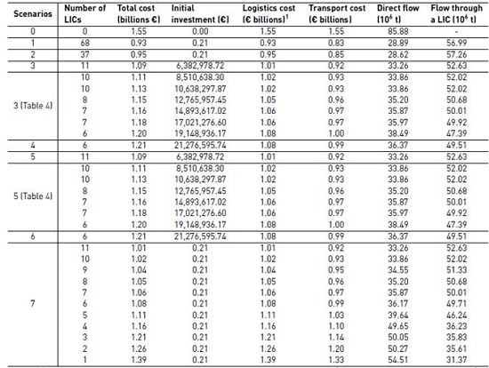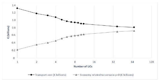 Regarding the total costs, it reached € 931.914 million in Scenario 1, increasing to € 951.063 million in Scenario 2. A greater cost in Scenario 2 was expected since, by not allowing LICs to be opened attracting less than 1 million t, the cost of transport increases. It happens because the intermodal transport (through a LIC) would be replaced by direct road transport. Nevertheless, Scenario 2 reflects more the economic reality since, it considers the minimum capacity of the facility.