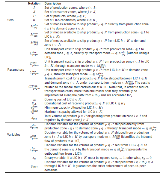 The location-allocation model presented by [5] is capacitated, multi-product and multi-echelon (although direct flows between origin-destination (O/D) are allowed, without the use of logistics integration structures), which seeks to optimize the total costs by installing LICs that promote intermodality. Besides, the following assumptions are adopted:
