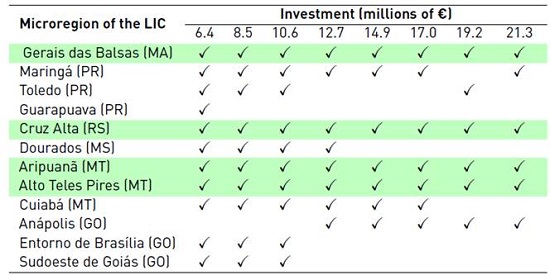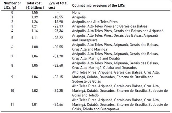 We verify that only four microregions are indicated to open, independent of the costs associated to the LICs installation: Gerais de Balsas, Cruz Alta, Aripuanã and Alto Teles Pires (highlighted in Table 4]. Similarly, there are regions enabled only when the investment is low, such as Guarapuva. Anápolis, on the other hand, is only indicated to be opened when the installation cost is at least € 12.7 million (since it probably concentrates flows from other regions and LICs that are no longer open). Therefore, it was possible to verify the trade-off between number of opened LICs and the value of initial investment. This discussion will be better detailed in Table 6.