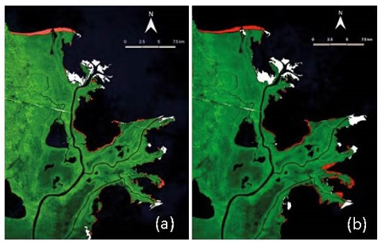 The image in Figure 5b is not clean enough and the algorithm interpreted some contrast as part of the shoreline, giving a false delineation. Therefore, the algorithm could fail if the image present strong contrasts (i.e., created by cloud shadows). In our case, most of the delta shoreline was delineated with high precision without these contrasting features in all years and therefore, we were able to track changes in the delta shoreline.