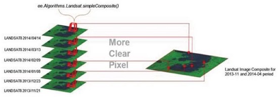 With these images we built image composites, using ee.Algorithms.Landsat.simpleComposite(), which selects a subset of scenes at each location, converts to TOA reflectance, applies the simple cloud score and takes the median of the least cloudy pixels, a measure less sensible to outliers [40]. Figure 2 illustrates the processes that we followed to obtain the image composition for the study period. Since each path-row image only covers part of the study area, we assembled mosaics of two images (images path-rows 10-54 and 10-55) to produce a spatially continuous image [40].