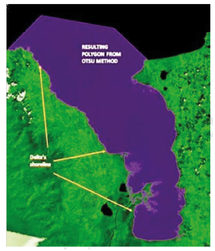 We set Landsat 5 1985-1986 as a baseline to compare the evolution (progradation or erosion) of the delta shoreline. To determine these changes, we delineated automatically the shoreline of all processed images and compared among themselves. We implemented the Otsu method [41], which is widely used for image segmentation. We use image’s histograms to automatically calculate an optimal threshold to split pixels in two classes (water and land). The Otsu method requires images to have bimodal histograms, which was the case for most of the images cleared from clouds. This methodology has already been used in satellite image analysis by [42] to assess the change in surface water at a global scale with GEE.