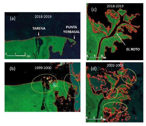 Figure 5c and d show El Roto mouth and its multiples channels. It was a challenge for the algorithm to discern the banks of these channels, especially when the lines were relatively close, but, as we see in Figure 5c, the delta frontline was clearly delineated. At El Roto, only one image was discarded due to noise [Figure 5d).