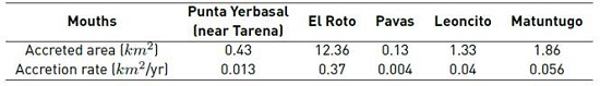 Progradation processes are important in almost all delta mouths, except for Tarena. Unlike erosion, which is distributed along all shorelines in the Delta, progradation concentrates in the mouth zones. This pattern could be due to the direct accumulation of sediments in the confluence of marine and fluvial processes that allow the deposition in the distal part of the mouths, before the final deposition of suspended sediments in the Gulf of Urabá.