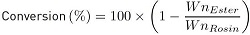 The conversion of rosin was used as a criterion to assess the esterification reaction. The acid value was determined according to ASTM D465-15. The dissolved reaction product (or rosin dissolved in methyl alcohol or isopropyl alcohol/toluene mixture) and 4-5 drops of phenolphthalein indicator was titrated with a standard solution of potassium hydroxide; the titration solution was standardized with potassium acid phthalate solution. The acid number (Wn) in mg/g was computed as shown in Equation (2),
