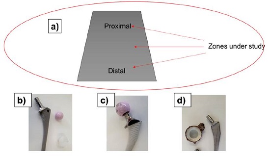 In this study, three kinds of explanted trunnions were analyzed: Ti-6Al-4V, Co-Cr, and stainless-steel. While they were in use, the Ti-6Al-4V trunnion and Co-Cr trunnions were paired to alumina heads. In addition, two kinds of stainless-steel trunnions were analyzed. One of these was paired to a CoCr head and the second to a stainless-steel alloy head. The service times of those prostheses were 1 year for the CoCr trunnion, around 10 years for the 316SS, while the Ti6Al4V trunnion was implanted for 8 years, approximately. All of them were removed because of infection and pain. Once explanted, the hardness of the trunnions was measured at the surface and in the bulk. Also, the chemical composition was determined by means of energy dispersive X-ray (EDX). In order to analyze wear on the trunnion surfaces, a scanning electron microscopy (SEM) was carried out using a Zeiss GEMINI 300 scanning microscope at a high vacuum environment, and optical profilometry was performed. All SEM images were made using an acceleration voltage of 3 kV and a working distance of 6 mm. 3D profiles were taken using a Laser Scanning Confocal Microscope, Keyence VK-X200 Series 3D. Data analysis was developed using the MultiFileAnalyzer 1.3.0.115 software. Figure 1 shows the prostheses under study and the analyzed zones: proximal, distal, and intermediate zones.