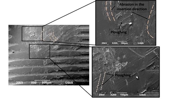 Some debris particles were observed around the deformed material Figure 3 a) - b). Small movements could cause some particles to be trapped in the deformed area. As long as the ploughing generates surface stacking between modular parts, there is less movement, and the ejection of metallic or oxidized worn particles is less likely.
