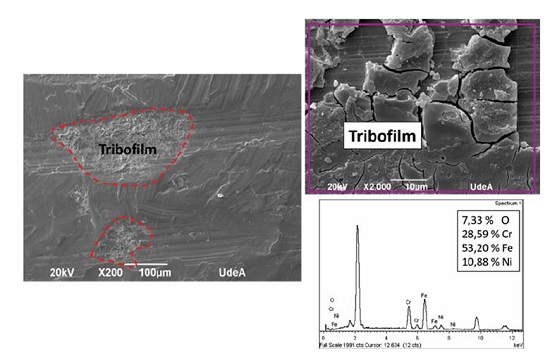 Moreover, in all cases, biofilm layers containing material from the alloys and probably, from the organic material in contact with them were identified on the surface. These layers are produced by the tribocorrosion mechanisms taking place on surfaces of the materials in contact, which slide against one another and are in contact with body fluids.