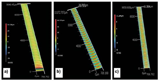 Some differences in the degradation level along the trunnion length can be observed from the 3D profilometry maps carried out on the trunnion. Several images along the trunnion length are taken by the confocal and laser microscope and are assembled in order to examine the trunnion extension. The most deformed areas are colored in red. As observed, bigger red zones were localized in the distal than in the middle and proximal region.