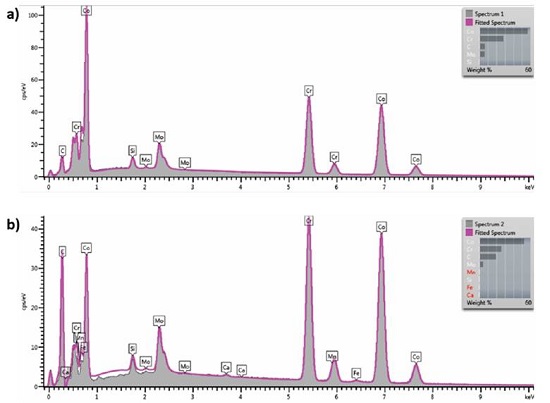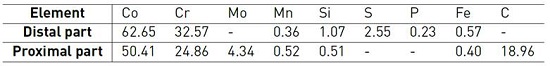 The trunnion made from CoCr alloy was characterized through EDX analysis. The corresponding spectra are shown in Figure 7, and the composition from different parts is indicated in Table 4. According to the literature, the identified composition corresponds to a typical CoCr biomedical alloy[22]. Despite this, elements such as Co, Cr, and C show higher concentrations, which may correspond to material transfer and body fluids. Taking into account that the femoral head was made from CoCr, as the trunnion, the material transfer cannot be successfully identified.