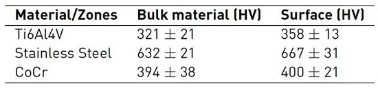 Hardness values of the trunnions are shown in Table 1. As expected, surface hardness is higher than bulk hardness, because of the oxide layer. The hardness of CoCr alloy is within the range of hardness reported by A. Lanzutti et al.[20].