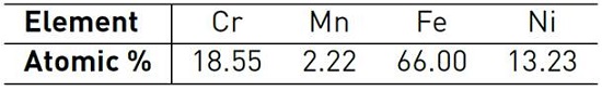 Detached particles can be observed in Figure 14. These particles have the same chemical composition as the SS prosthesis. Moreover, no oxygen is observed, which indicates the presence of metallic material. In addition, EDX analysis in Figure 15 shows a material layer formed on the material surface similar to those reported in previous studies[16] [25] [26]. These films, known as a tribofilm, are formed by the oxidized and metallic material worn from both interfaces in contact. The layer was found on the explanted trunnion of 316L stainless steel, which was paired against a Co-Cr alloy head. The alloy contains an average of 18.55% of Cr, according to EDX (see Table 5 and Figure 11]. However, the chemical analysis of the surface covered by organic material exhibits higher contents of Cr, of 28.51 %, as well as oxygen contents of 7.33 % [Figure 15]. This chromium excess and oxygen could indicate fretting corrosion in this system, with material transfer from the Co-Cr alloy to the SS trunnion.