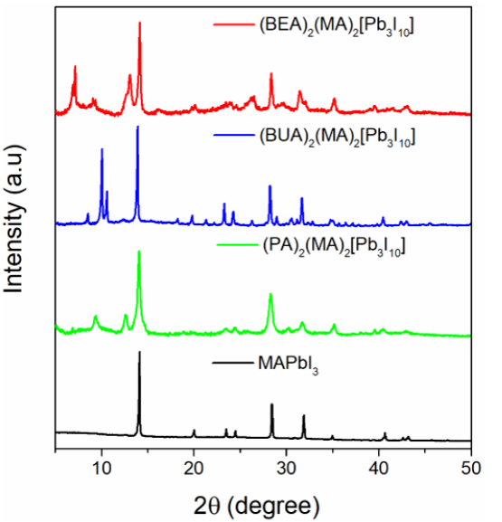 The structure of the obtained materials was corroborated by X-ray diffraction (XRD). As shown in Figure 2, the 3D structure of the MAPbI3 perovskite was modified, and hybrid layered perovskites were obtained, as confirmed by the appearance of the new peaks at low diffraction angles. The layered materials corresponded to (PA)2(MA)2Pb3I10, (BUA)2(MA)2Pb3I10, and (BEA)2(MA)2Pb3I10, a product of slicing the 3D perovskite into well-defined 2D slabs.