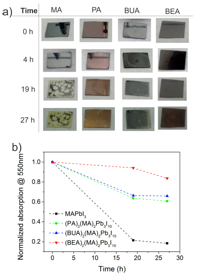 In order to explore the stability in the layered materials, the films were exposed to a moisture stability test at ~80% Relative Humidity. Figure 3a shows the evolution of the films up to 27h exposition time. MAPbI3 sample showed very evident degradation, and after 19h, translucent yellowish zones were formed, indicating perovskite hydration.[26] On the other hand, the layered samples only started to show some important change in color after 27h, and therefore, they were more stable, as shown in Figure 3b. The stability trend followed the previous indications in which more stable films are obtained when a larger cation is introduced.