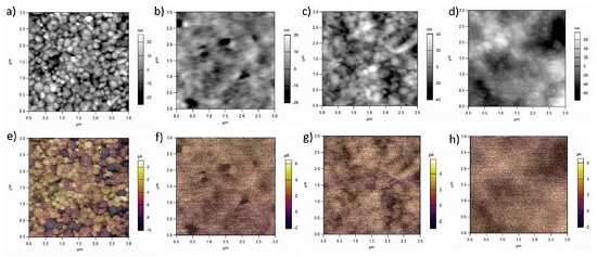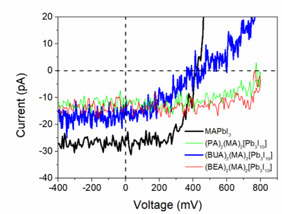 In order to study both, photoactive and transport properties of the films, photoconductive AFM was performed. The films were illuminated while a voltage sweep between -400mV and 800mV was applied. This allowed obtaining a J-V curve that served to compare the photovoltaic properties of the films, as indicated in Figure 5. The generated current followed the decreasing order, 3D MAPbI3 >BUA- >BEA-> PA-based 2D perovskites, but the Voc increased in the opposite way because of the larger band gaps of the layered perovskites. The photoconductive AFM images were superposed to the morphology images, as shown in Figure 4e-4h. 3D MAPbI3 presented a well-defined contrast between the produced current and each individual grain, similar to reports that suggested transport dependence upon material’s facets[30]. The (BUA)2(MA)2Pb3I10 sample was the only layered perovskite that produced some contrast between grains, indicating the closer behavior to a 3D perovskite.