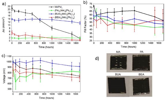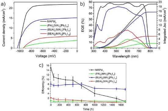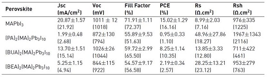 The high quality and uniformity of the layered perovskite films encouraged the fabrication of planar photovoltaic devices. Solar cells fabricated with these films yielded interesting results compared to the 3D perovskite. Table 1 summarizes the photovoltaic performance of the fabricated devices. The reference device for the MAPbI3 sample resulted in an average power conversion efficiency of 15.02%, with a best performing device of 16.16%. (PA)2(MA)2Pb3I10 and (BEA)2(MA)2Pb3I10 devices presented an average efficiency of 1.10% and 2.19%, respectively. This low performance was mainly determined by the low obtained current. This is an expected result since the relatively poor efficiency in layered systems is due to the inhibition of out-of-plane charge transport by the organic cations, which acts as an insulating spacing layer between the inorganic conduction slabs, and therefore, one approximation to the best results relies on the possibility to have films with a preferential out-of-plane alignment with respect to the contacts to facilitate efficient charge transport[17]. The improved current for the (BUA)2(MA)2Pb3I10 layered perovskite material led to better photovoltaic performance, reaching a 10.35% best and an 8.25% average efficiency, respectively.
