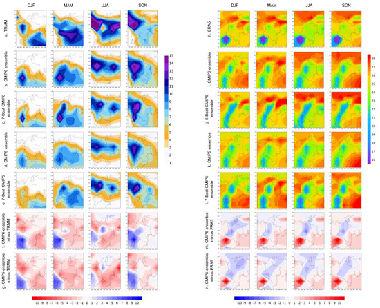 For instance, CMIP6 models simulate the largest precipitation rates in western Colombia throughout the year, especially in September-October-November (SON), the increased precipitation in the Orinoco region during March-April-May (MAM) and June-July-August (JJA), and the increased precipitation over the Colombian Amazon during MAM [Figure 1c). Likewise, CMIP6 models capture the lowest precipitation rates in the Caribbean region of Colombia during the entire year, especially in December-January-February (DJF) [Figure 1c). Although the CMIP6 models reduced their mean biases with respect to CMIP5 models, they still underestimate precipitation in Colombia [Figure 1f). For temperature, both CMIP5 and CMIP6 models show a similar spatial pattern of their biases, with surface temperature generally underestimated in the Andean region of Colombia while overestimations are observed in the Colombian Amazon and Orinoco regions [Figures 1m and 1n). These temperature biases increase in the CMIP6 models, mainly over the Colombian Andes [Figures 1m and 1n), suggesting limitations in the new generation of GCMs to reproduce air surface temperatures in regions with complex topography like the north tropical Andes.