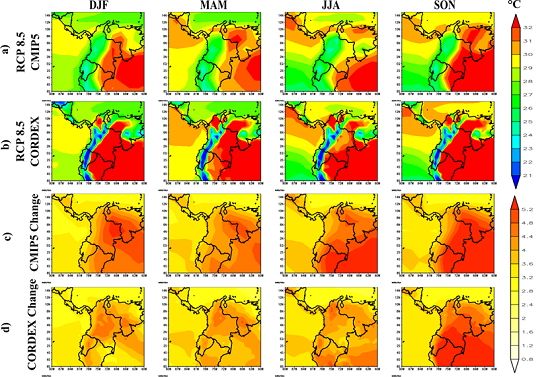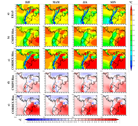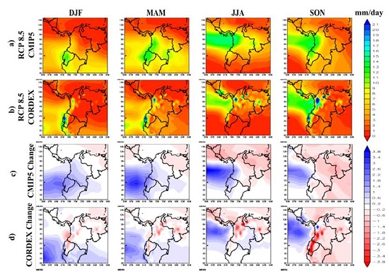 Thus, the analysis from CMIP6 projections suggests changes toward reduced precipitation and increased temperature by the end of the 21st century over the Orinoco and Colombian Amazon in JJA and SON [Figure 6]. These projections are also suggested by CORDEX downscaled CMIP5 projections [Figures 11d and 12d), although projected changes are larger for the CMIP6 models. Projected changes over the Colombian Andes are not clear, probably due to the larger biases of the CMIP models over this region characterized by a complex topography [Figure 1].