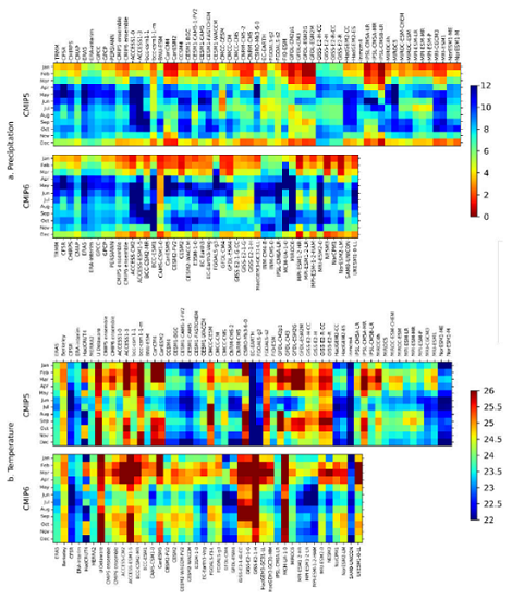 For a more complete assessment of how the CMIP5/CMIP6 models simulate precipitation and air surface temperature in Colombia, Figure 5 shows the Taylor diagrams for these variables according to 8 observational/reanalysis datasets, 49 CMIP5 models, and 33 CMIP6 models. For air surface temperature, 6 observational/reanalysis datasets are considered. These diagrams use TRMM and ERA5 as reference data for precipitation and temperature, respectively. According to these diagrams, the best models simulating the variables of interest are those exhibiting the lowest RMSE, highest spatial correlations, and standard deviations closest to the reference dataset[78].