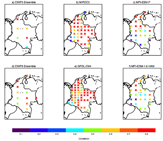General Circulation Models (GCMs) are one of the most used tools to evaluate the possible impacts of increased atmospheric concentrations of greenhouse gases (GHG) and anthropogenic aerosols, despite the systematic biases and uncertainties they exhibit[7]. The Coupled Model Intercomparison Project (CMIP) is an initiative that has allowed a better understanding of the climate system and its responses to human activities[8]. The fifth and sixth phases of CMIP (CMIP5 and CMIP6, respectively) include the most recent developments in global climate modeling[9, 10]. Although CMIP5 and CMIP6 models improved their simulations of global climate with respect to the previous generations, they still exhibit systematic biases and uncertainties[7] [11-14]. In particular, these models exhibit larger biases for precipitation than air surface temperature simulations not only at global[7, 13] but also at regional scale in northern South America, including Colombia[15-20]. In particular, the effects of clouds and aerosols and their interactions are among the causes for these persistent biases[7, 13, 21, 22].