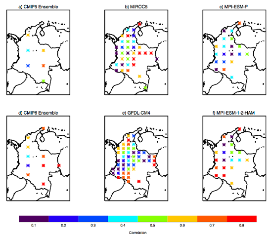 The annual cycles of precipitation and air surface temperature largely vary between different regions in Colombia[23-31]. Moreover, satellite products like TRMM (considered here as the reference dataset for precipitation) exhibit biases in Colombia, with overestimations in the Andes and underestimations in the Pacific region[81]. Therefore, we also compare model simulations with respect to climatological annual cycles from IDEAM gauges located across the country. Figure 3 [Figure 4] shows the correlations between climatological annual cycles of precipitation (temperature) from the IDEAM gauges and those simulated by the CMIP5/CMIP6 models. These correlations are computed following the methodology proposed by[18]. This methodology estimates the correlation between the annual cycle of all the gauges within the same grid cell of a particular model and the mean annual cycle simulated by the model in the corresponding grid cell. Then correlations for gauges within the same grid cell are averaged to obtain a mean correlation for each grid cell. The gauges considered for each model are those located within the land mask given by their horizontal resolution.
