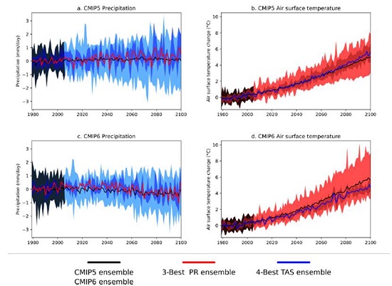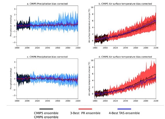 The projections of the domain-average precipitation in Colombia suggest differences between CMIP5 and CMIP6 models. While the ensemble means of the CMIP6 models show a slight decrease of domain-average precipitation in Colombia throughout the 21st century [Figure 7c), CMIP5 models project slight increases of this variable [Figure 7a). The ensemble of the best models of each CMIP generation reproduces a projected change with the same sign as their respective complete ensemble [Figures 7a and 7c).