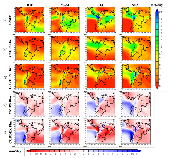 Figure 9 shows that the spatial distribution of the mean precipitation biases with respect to TRMM for the 9 models considered is very similar between the CORDEX and the CMIP5 historical simulations, with clear underestimation in most of Colombia, except in MAM, JJA and SON over the Colombian Andes, where both downscaled and original simulations overestimate precipitation with respect to TRMM. An overestimation of precipitation by the CORDEX and CMIP5 simulations is also observed in the equatorial Pacific throughout the entire year. These precipitation biases in Colombia and the equatorial Pacific are observed when considering the ensemble mean of the 49 CMIP5 models [Figure 1g). However, the downscaled CORDEX simulations exhibit precipitation biases in Colombia, with underestimations of about 6-8 mm/day in the Orinoco and Colombian Amazon and overestimations of about 8-10 mm/day in the Colombian Andes, mainly during JJA and SON. These biases are much larger than those in the original simulations, with underestimations of about 2-4 mm/day in the Orinoco and Colombian Amazon and overestimations of about 2-4 mm/day in the Colombian Andes. These precipitation biases in the ensemble mean of the CORDEX simulations are observed in the 9 CMIP5 models considered, particularly in the CNRM-CM5, CSIRO-Mk3-6-0, HadGEM2-ES, MIROC5, and MPI-ESM-LR models.