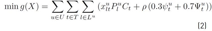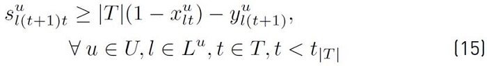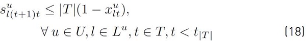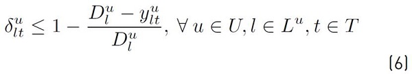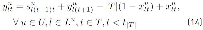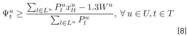 Equation (3) is not linear. In order to get a linear model, linearization of[14] is applied to obtain a linear model without increasing the number of integer variables. Therefore, continuous variable is introduced and Equation (3) is replaced by Equation (14)- (18).
